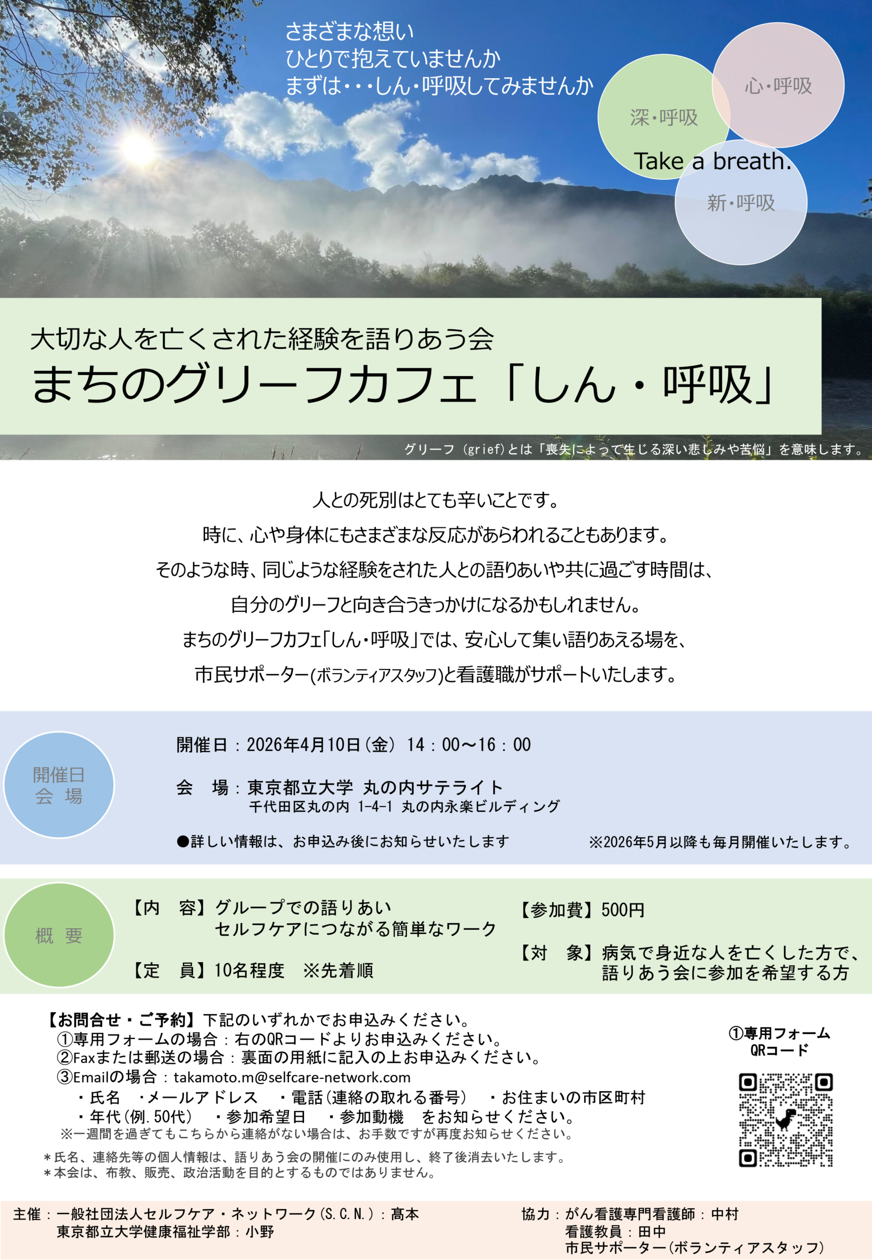 4月10日(金)「まちのグリーフカフェしん・呼吸」(病気で家族を亡くした方の語り合う会)が開催されます